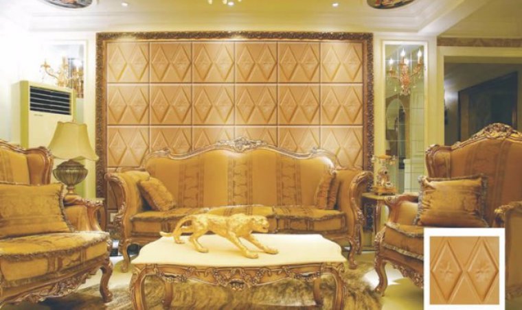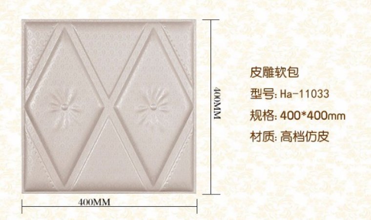 寓意内涵:成双成对皮雕软包背景墙图案设计搭配简洁又时尚。错落有致格子印在皮雕软包上很有有个性,解决客厅墙面的简单同时也很好的装饰了生活格调。